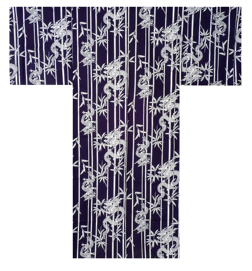 En klassisk herre-yukata i dyb marineblå bomuld med et elegant mønster af bambus og drager.