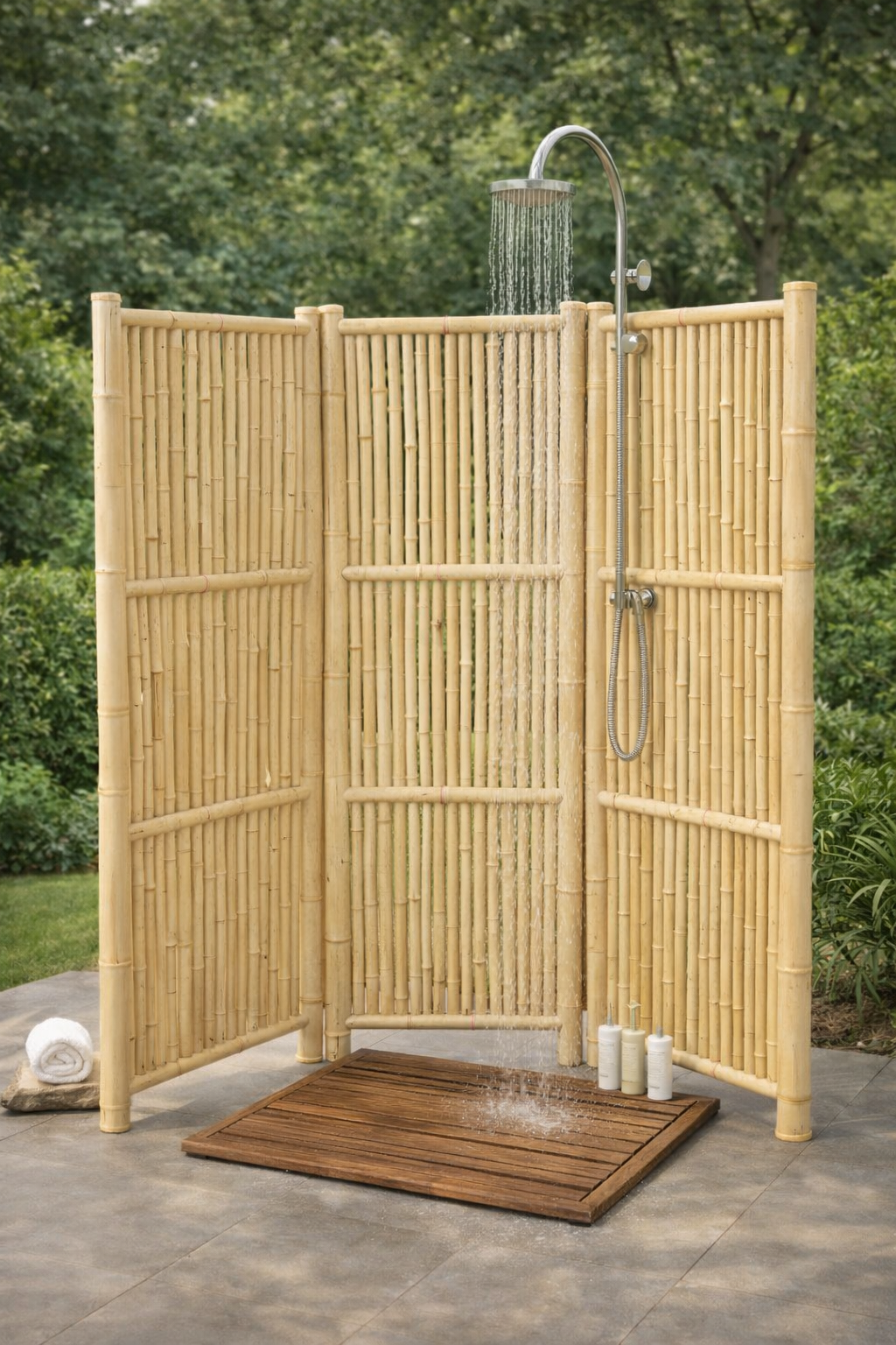 Den naturlige variation i bambusrørene giver et levende og autentisk udtryk, og den lyse farve fremhæver de varme toner i hegnet.