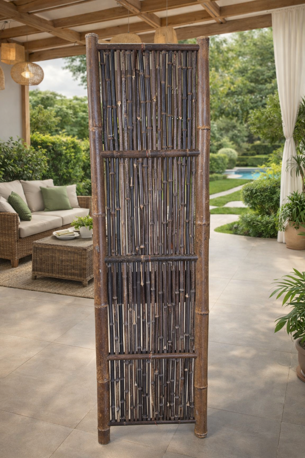 Den naturlige variation i bambusrørene giver et levende og autentisk udtryk, og den mørke farve fremhæver de varme toner i hegnet.