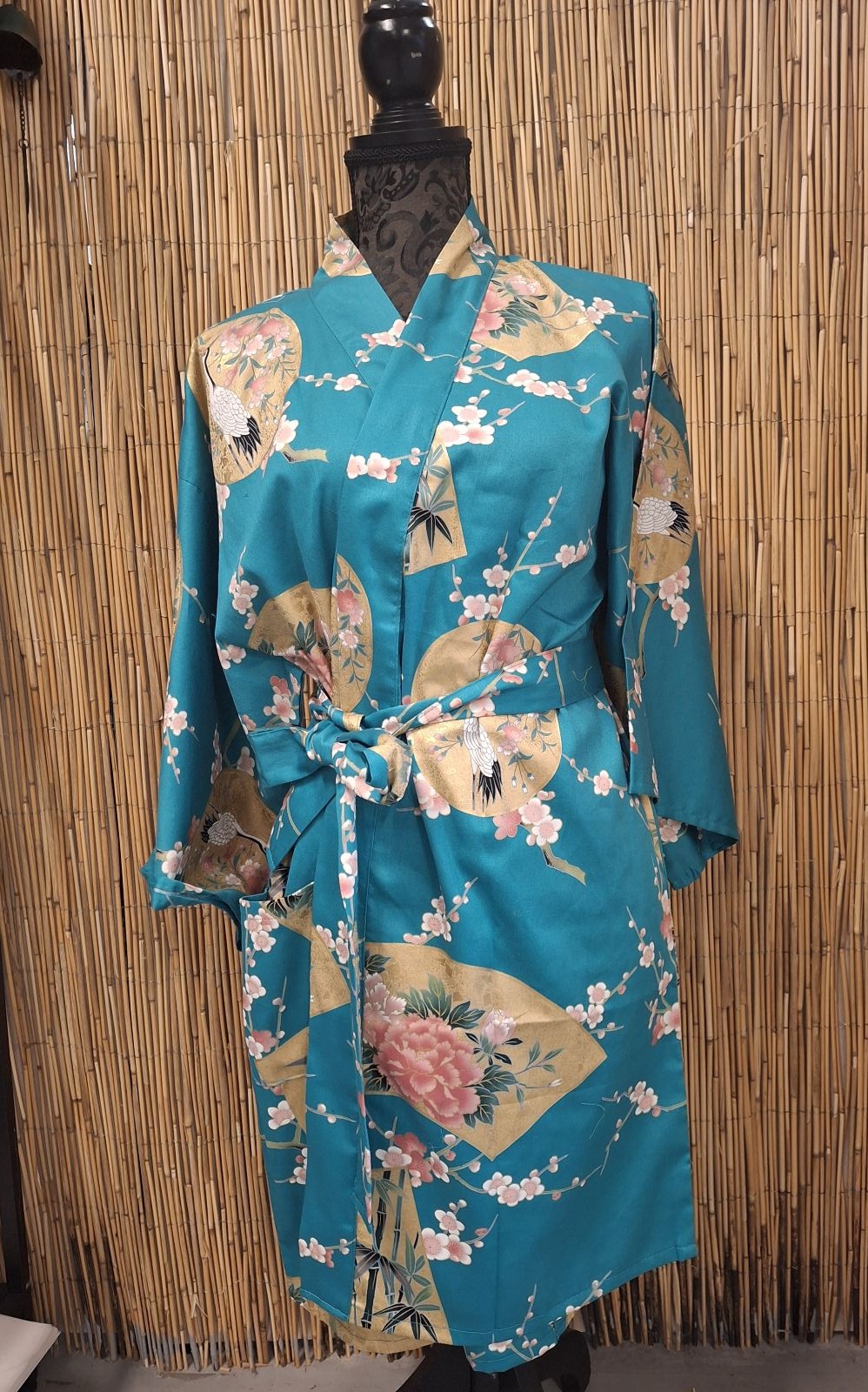 Elegant kort kimono i strålende turkis farve, prydet med traditionelle japanske motiver af blomstrende kirsebærgrene, vifter og bambus.