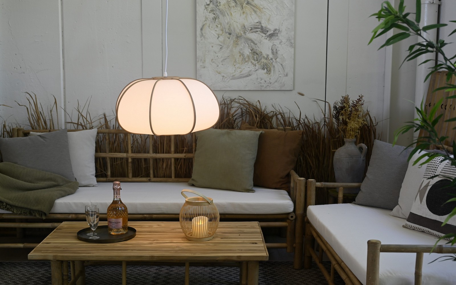 Meget smuk hænge lampe med coated papir og ribber af bambus.