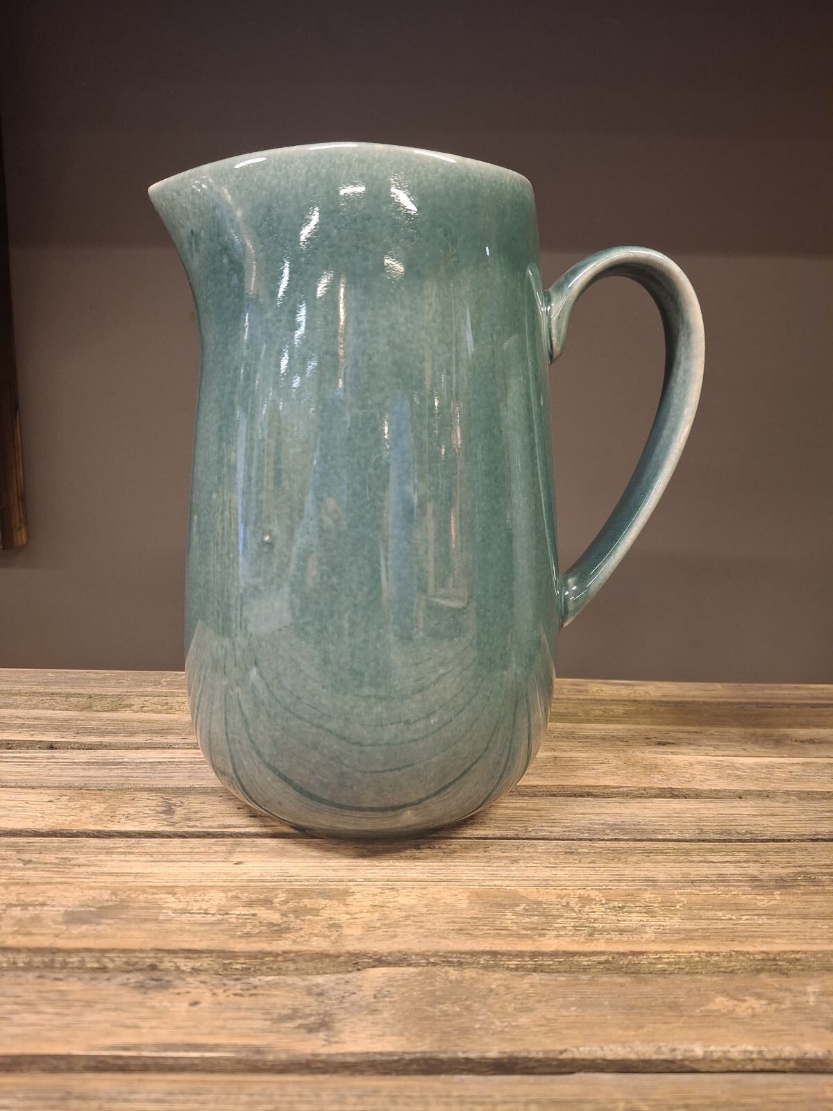Smuk og stilren kande i glaseret porcelæn med en blød havgrøn tone.