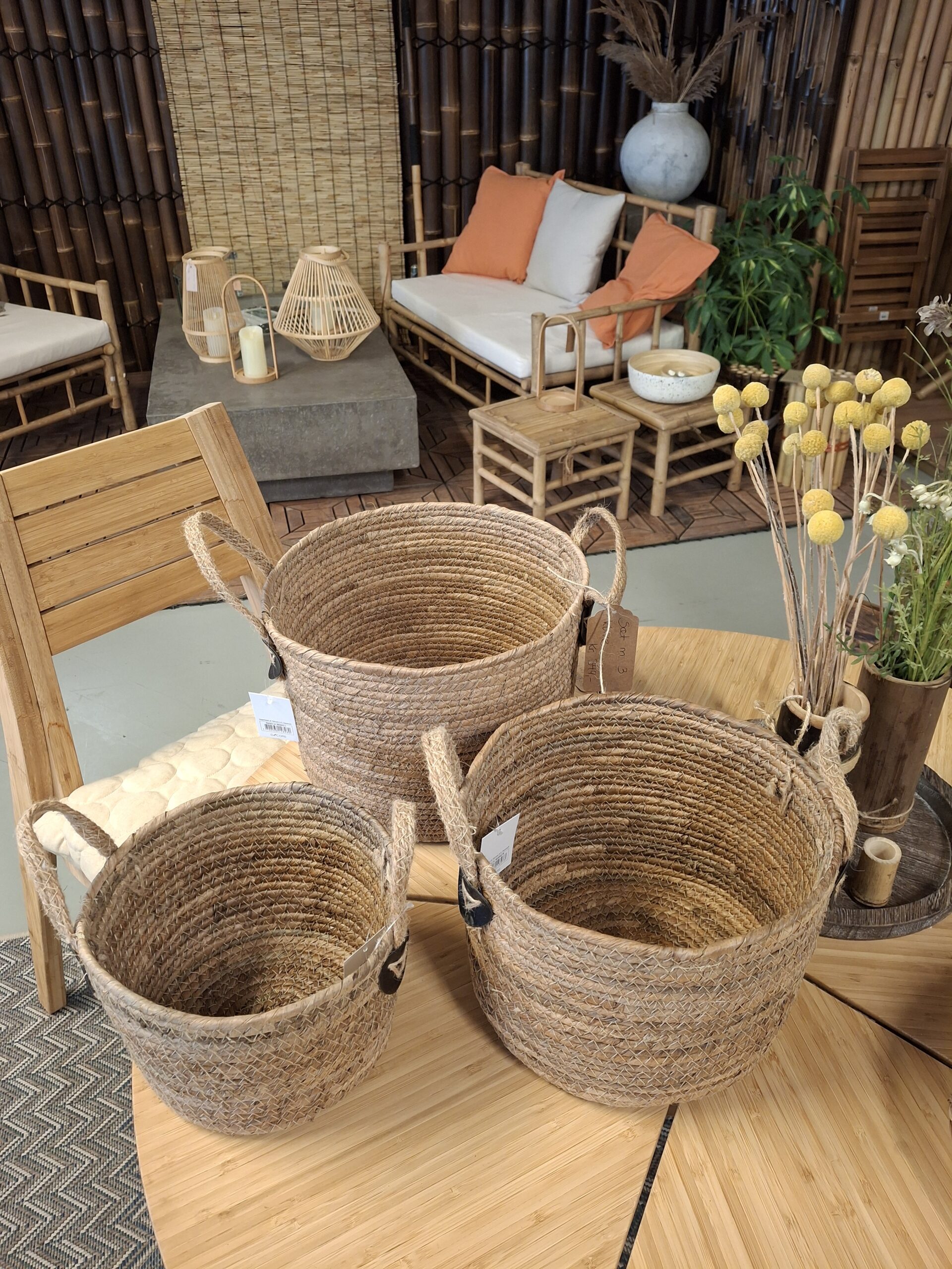 Håndflettede kurve i naturligt jute med håndtag af bananblade. Bringer varme og hygge i hjemmet. Kan bruges til alt fra opbevaring af strikketøj, tæpper og til småting, også i entreen…..