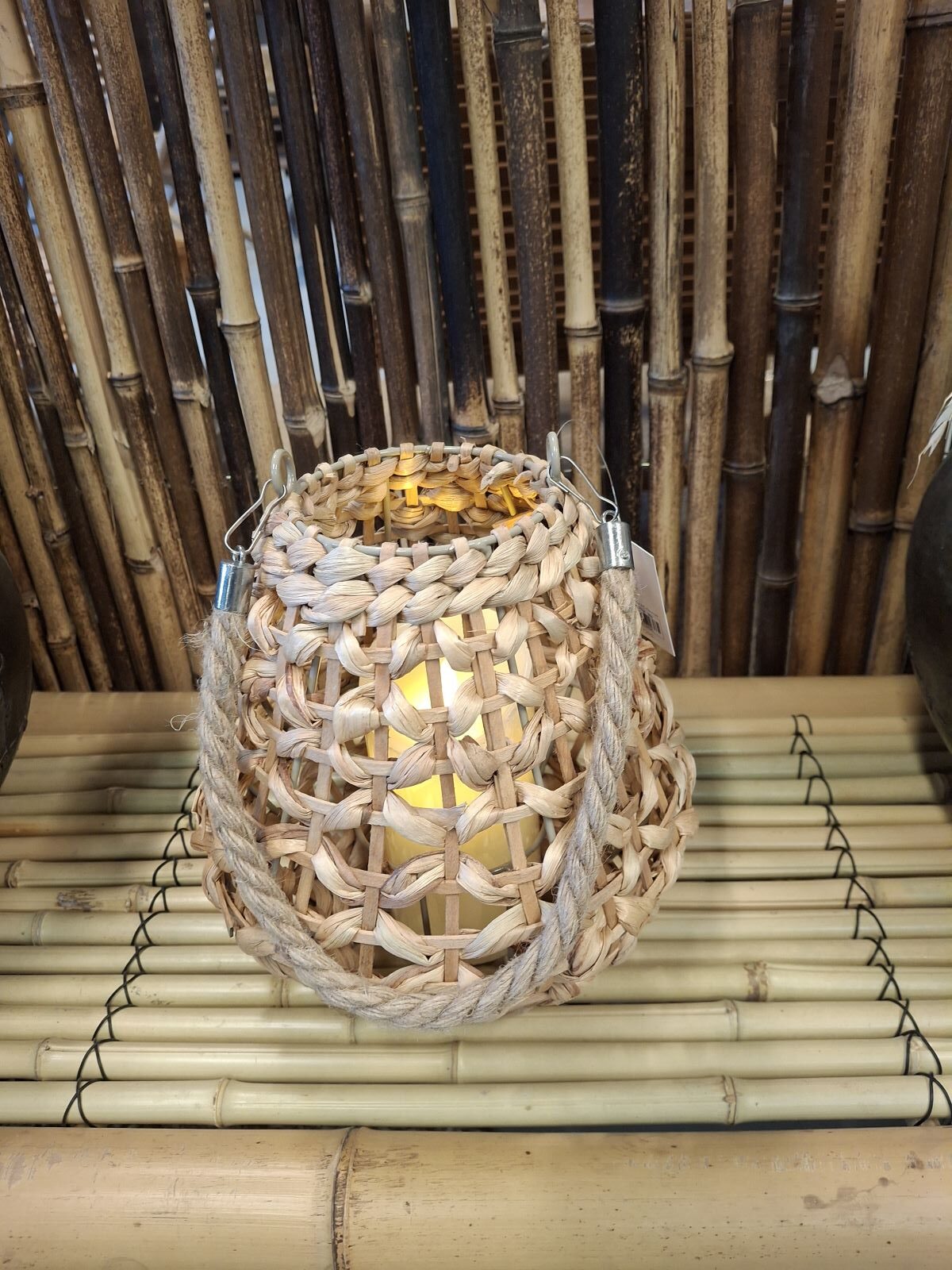 Denne super søde lanterne i vandhyacint kan bruges både ude og inde, dog kan de ikke lide for meget vand, så gerne ind når det regner, eller stå hvor der er læ for regnen. Bruges den ude får den naturligvis patina. Man kan sætte både levende lys eller lys på batteri i denne lampe, og der medfølger en glasindsats som beskytter lyset og lampen. Der er et reb som hank, der går at den også kan hænges op.