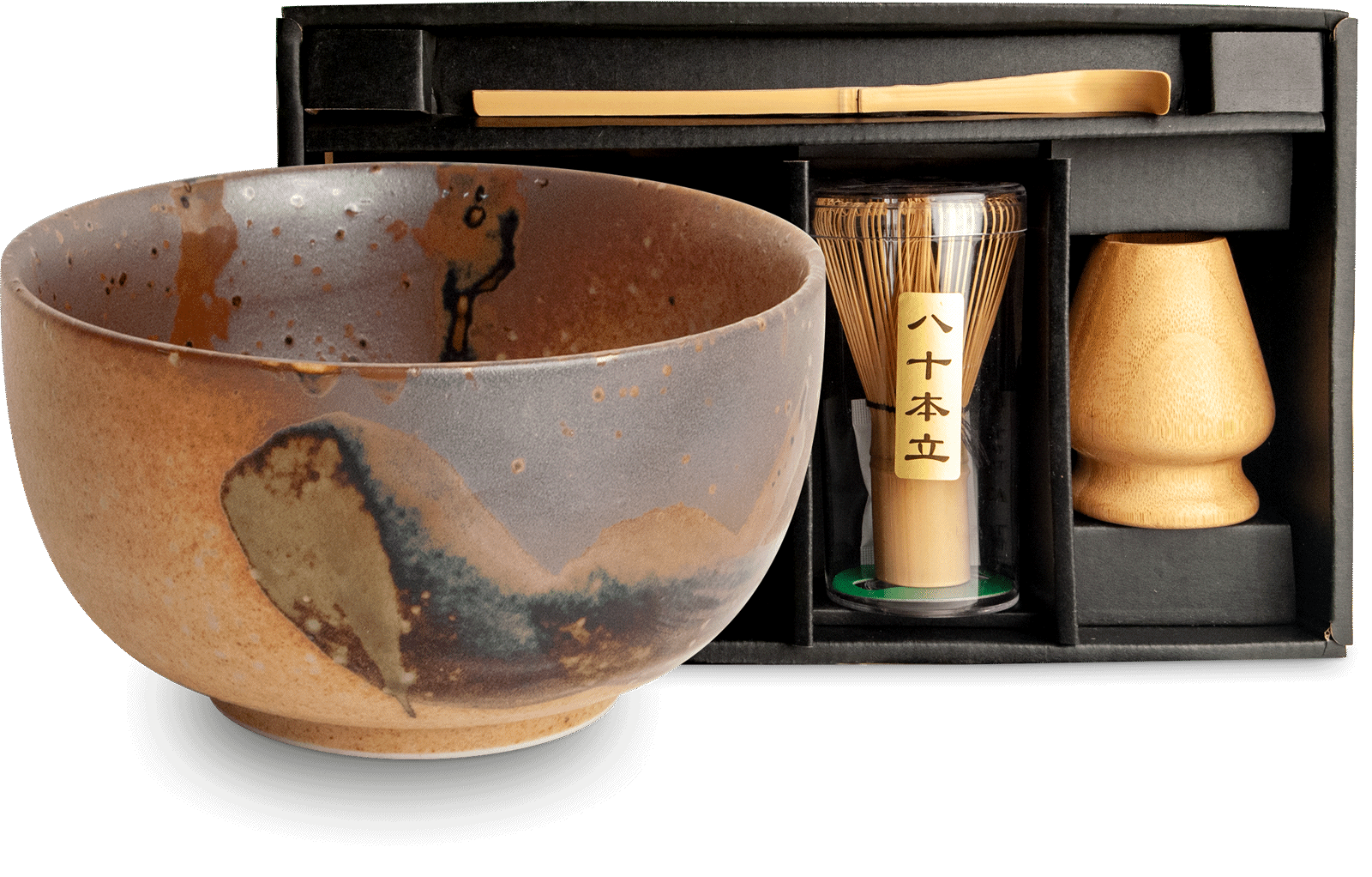 Smukt matcha sæt i 4 dele bestående af skål, bambus piskeris (chasen) samt holder til piskeris og bambus ske (chashaku).