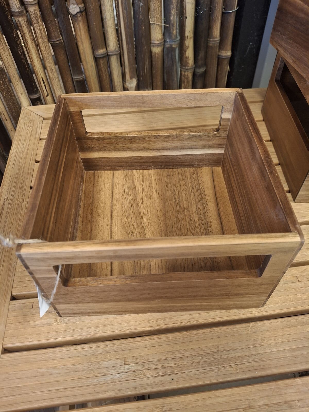 Akacietræs kasse – en kel og stilren opbevaringskasse. I siderne er der udskårne håndtag.