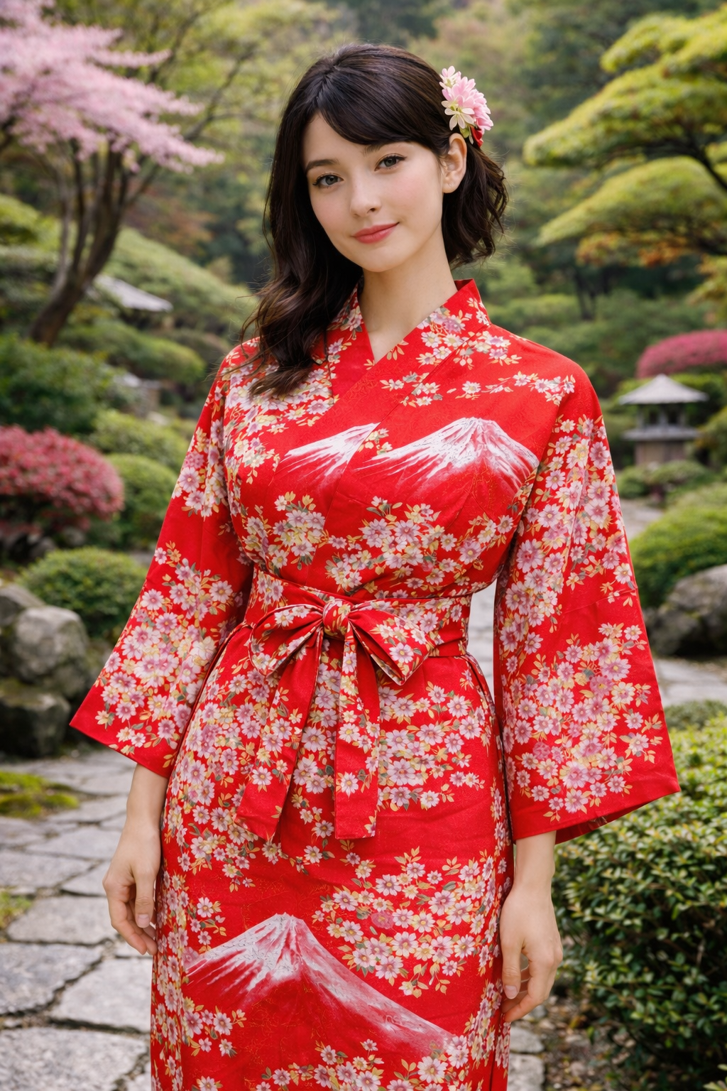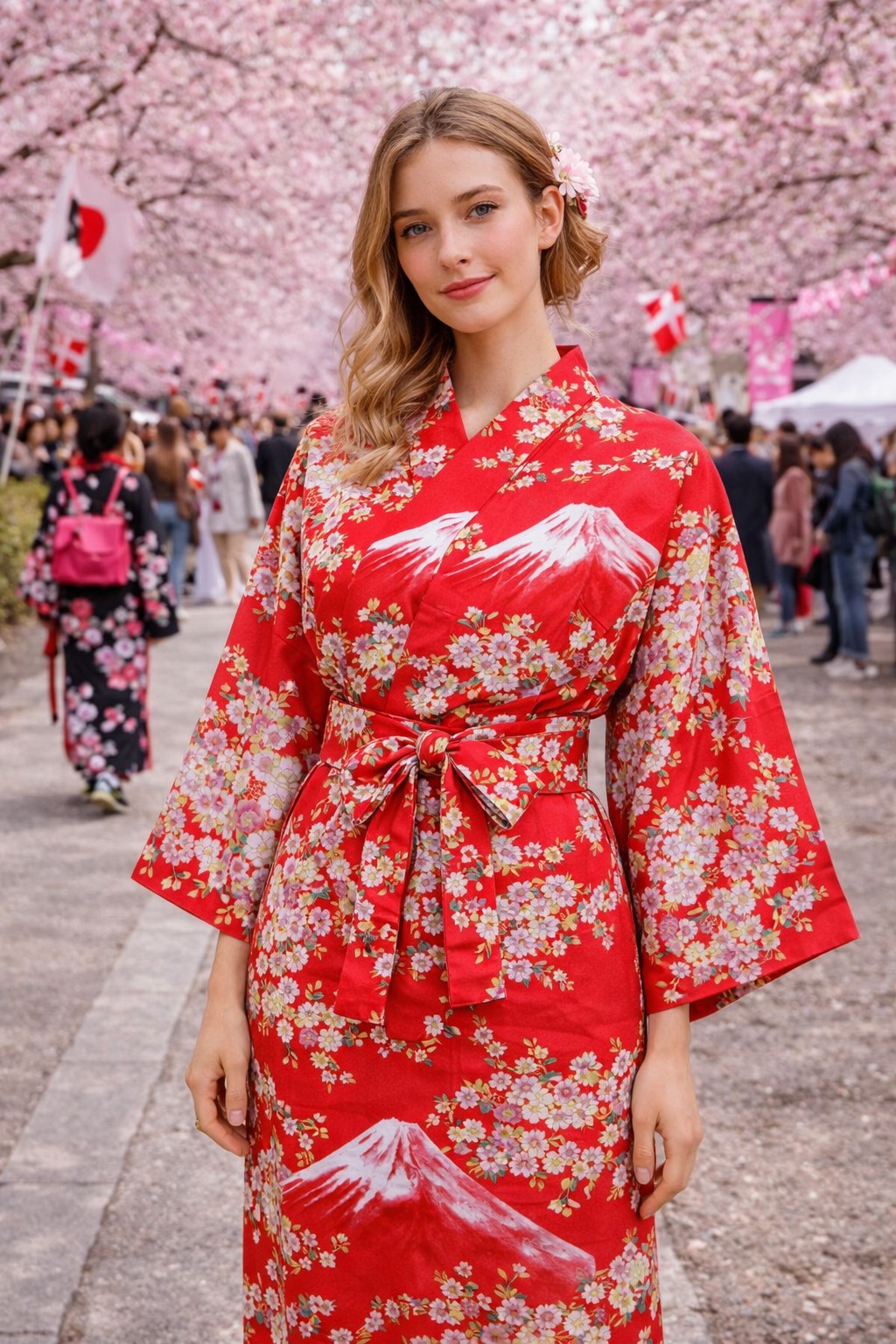 En elegant japansk yukata i en støvet smuk rød farve med det ikoniske motiv af Mount Fuji om givet af blomstrende Sakura kirsebær
