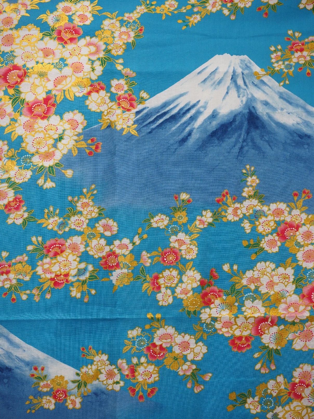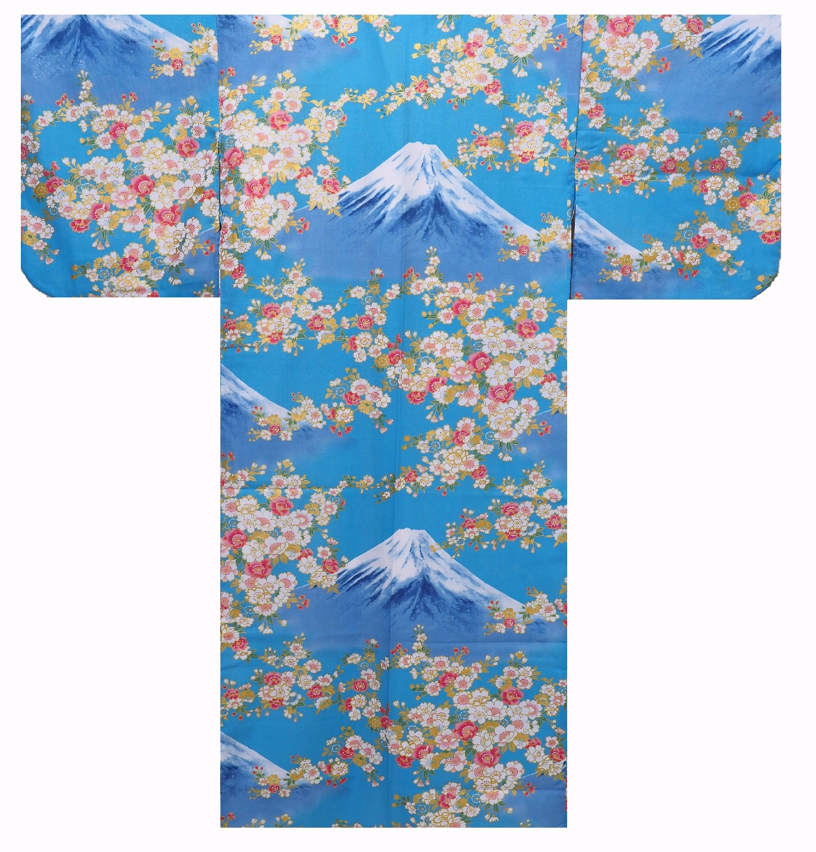 En elegant japansk yukata i klar lys blå med det ikoniske motiv af Mount Fuji om givet af blomstrende Sakura kirsebær
