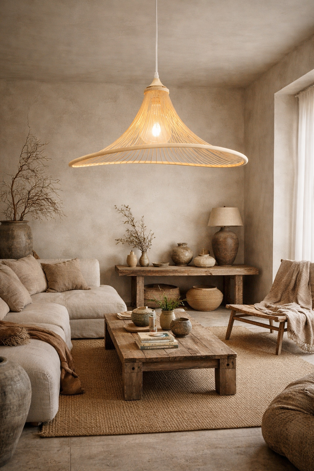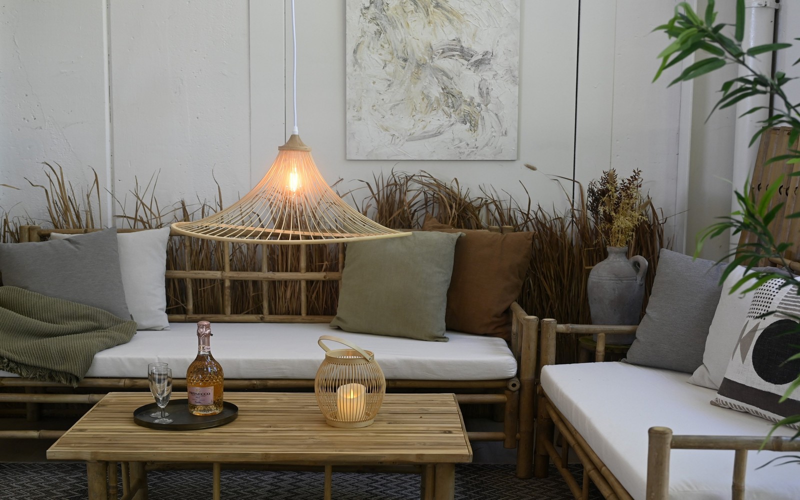 Meget smuk hænge lampe med skærm i bambus, der ved sit mønster i skærmen kaster et smukt lys ud i rummet.