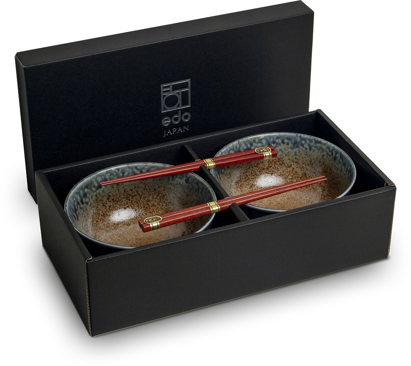 Sættet indeholder to håndlavede porcelænsskåle med et unikt motiv i blå og brunlige nuancer samt 2 sæt spisepinde.